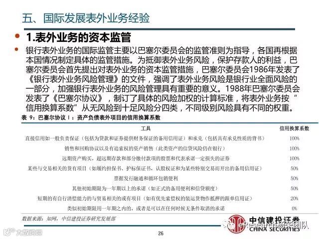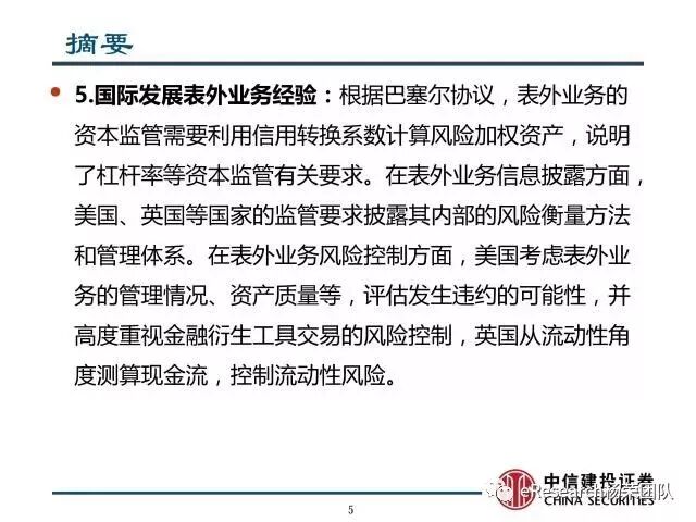 5、国际发展表外业务经验:根据巴塞尔协议,表外业务的资本监管需要利用信用转换系数计算风险加权资产,说明了杠杆率等资本监管有关要求。在表外业务信息披露方面,美国、英国等国家的监管要求披露其内部的风险衡量方法和管理体系。在表外业务风险控制方面,美国考虑表外业务的管理情况、资产质量等,评估发生违约的可能性,并高度重视金融衍生工具交易的风险控制,英国从流动性角度测算现金流,控制流动性风险。
