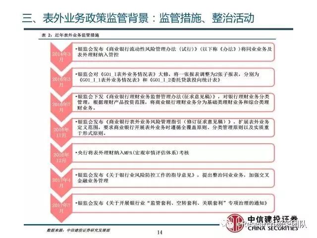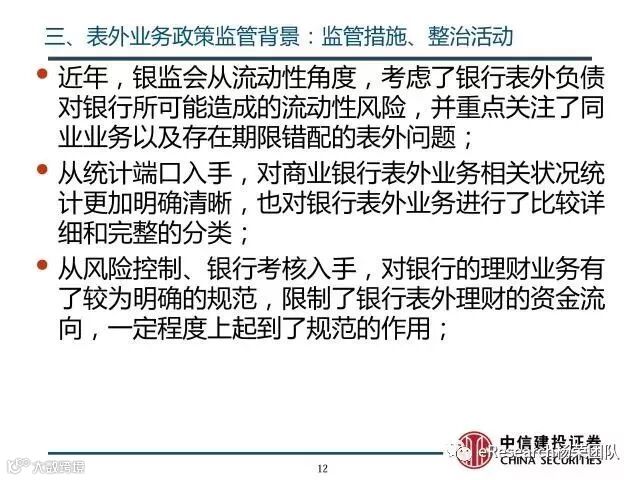 3、表外业务政策监管背景:近年,银监会从流动性角度,考虑了银行表外负债对银行所可能造成的流动性风险,并重点关注了同业业务以及存在期限错配的表外问题;从统计端口入手,对商业银行表外业务相关状况统计更加明确清晰,这也对银行表外业务进行了比较详细和完整的分类;从风险控制、银行考核入手,对银行的理财业务有了较为明确的规范,限制了银行表外理财的资金流向,一定程度上起到了规范的作用;从同业业务入手,加强交叉金融业务管理,将同业业务纳入流动性风险监测范围,并强调要准确计量风险,足额计提资本和拨备。对商业银行的表外业务尤其是表外理财的监管不断收紧,发布、修订了多项表外业务活动有关规定,意在遏制表外业务的过度扩张并控制表外业务风险以免对商业银行、行业造成巨大的冲击。
