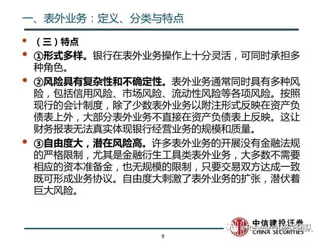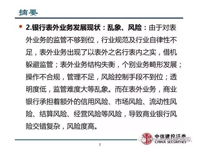 2、银行表外业务发展现状:乱象、风险:由于对表外业务的监管不够到位,行业规范及行业自律性不足,表外业务出现了以表外之名行表内之实,借机躲避监管;表外业务结构失衡,个别业务畸形发展;操作不合规,管理不足,风险控制手段不到位;透明度低,监管难度大等乱象。而在表外业务,商业银行承担着额外的信用风险、市场风险、流动性风险、结算风险、经营风险等风险,导致商业银行风险交错复杂,风险度高。