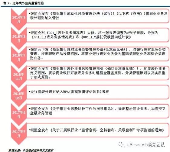 2016年7月,银监会下发《商业银行理财业务监督管理办法(征求意见稿)》。对银行理财业务监管重点包括了:对银行理财业务分类管理,分为基础类理财业务和综合类理财业务;禁止发行分级产品;银行理财业务进行限制性投资,不得直接或间接投资于本行信贷资产及其受(收)益权,不得直接或间接投资于本行发行的理财产品,不得直接或间接投资于除货币市场基金和债券型基金之外的证券投资基金,不得直接或间接投资于境内上市公司公开或非公开发行或交易的股票及其受(收)益权,不得直接或间接投资于非上市企业股权及其受(收)益权。对银行的理财业务有了较为明确的规范,限制了银行表外理财的资金流向,一定程度上起到了规范的作用。