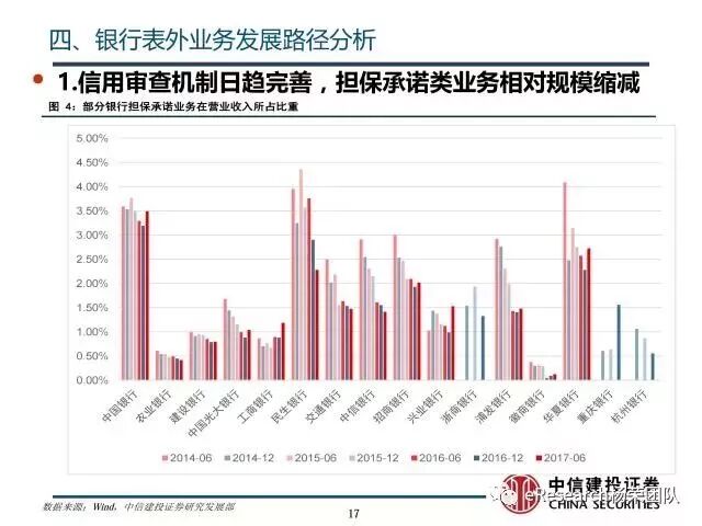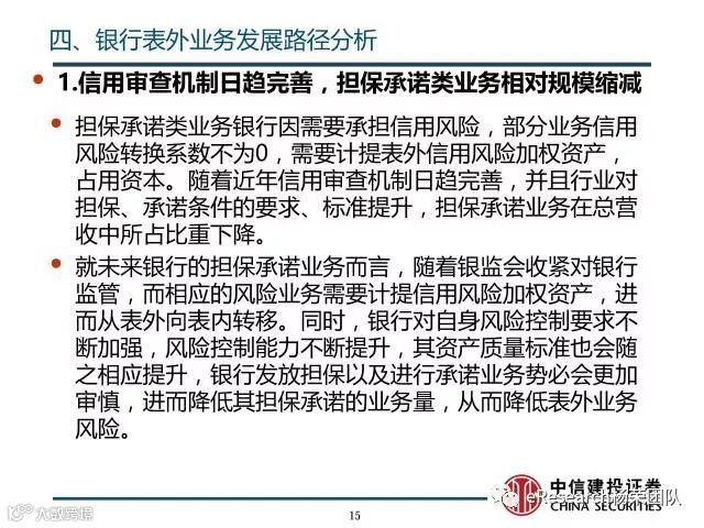 ①随着银监会收紧对银行监管,相应的风险业务需要计提信用风险加权资产,商业银行对担保承诺等业务信用审查机制日趋完善,担保承诺类业务的业务所占比重会不断收缩,其相对规模会不断下降;