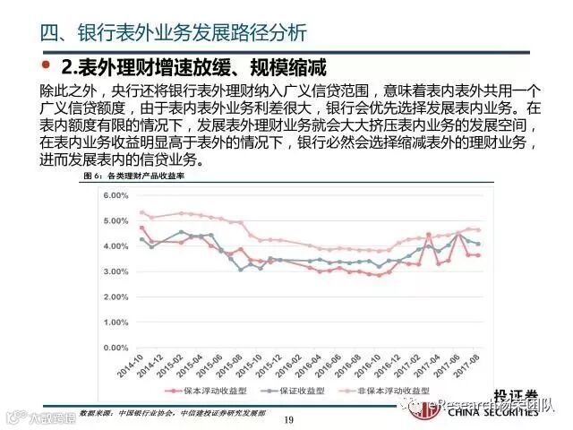 在表内表外共用一个广义信贷额度时,由于表内表外业务利差很大,银行会优先选择发展表内业务。根据中国银行业协会发布的收益率数据来看,非保本理财产品的收益率高于保本型理财产品的收益率。意味着银行经营表外非保本理财产品所需要的成本大于表内保本型理财产品的成本。表外业务的非保本理财利差小于表内业务的保本理财的利差。在表内额度有限的情况下,发展表外理财业务就会大大挤压表内业务的发展空间,在表内业务收益明显高于表外的情况下,银行必然会选择缩减表外的理财业务,进而发展表内的信贷业务。而随着银监会打破刚性兑付的要求收紧,表内保本理财产品资金会流向其他表内的信贷业务如消费信贷等。由于保本理财产品仍存在客户需求,在当下依然存在一定的生存空间。