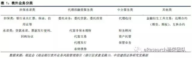 根据16年发布的《商业银行表外业务风险管理指引(修订征求意见稿)》,并根据业务性质,对其中提到的担保承诺类、代理投融资服务类、中介服务类等业务进行再分类。