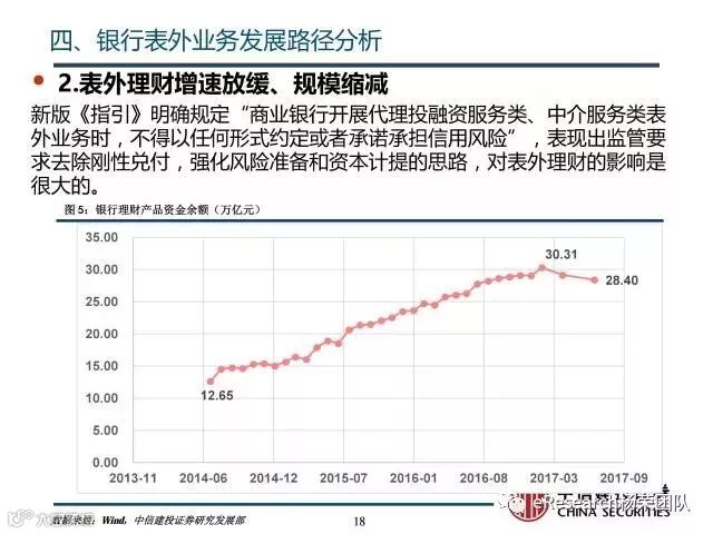 4、银行表外业务发展路径分析:①随着银监会收紧对银行监管,相应的风险业务需要计提信用风险加权资产,商业银行对担保承诺等业务信用审查机制日趋完善,担保承诺类业务的业务所占比重会不断收缩,其相对规模会不断下降;②随着打破刚性兑付的监管思路的进一步实施,银行表外理财进一步受限;在银行理财纳入广义信贷额度范围后,由于表内外业务的资本成本和利差,银行会将资产从表外转回表内,尤其是收益较低的同业理财部分表现得最为明显。表外理财业务规模会不断下降,资金回转入表内信贷业务;③中介服务类业务受监管影响不大,保持相对稳定,其业务规模会不断扩大;④随着监管活动加强,金融衍生业务资金转回表内,相关业务规模扩大速度得到遏制。