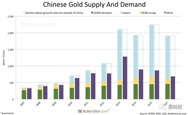 上面的数字反应的是2016年的情况。据暴哥所知,其实从2012年黄金价格下跌开始我们一直是保持进口+生产大于官方增持+消耗的情况。