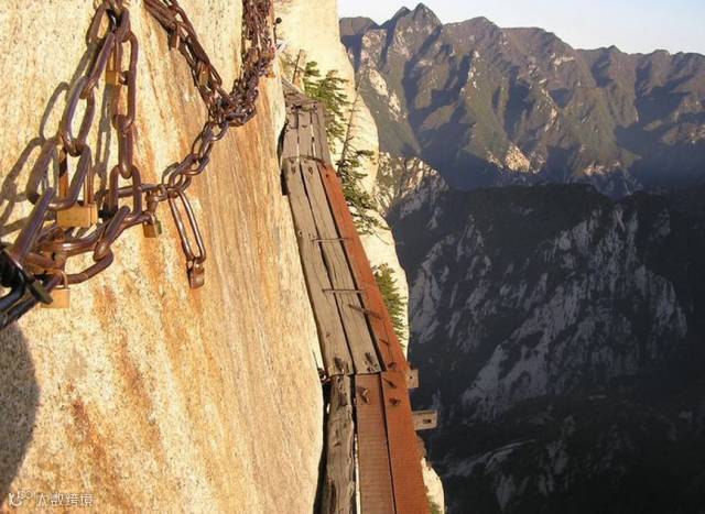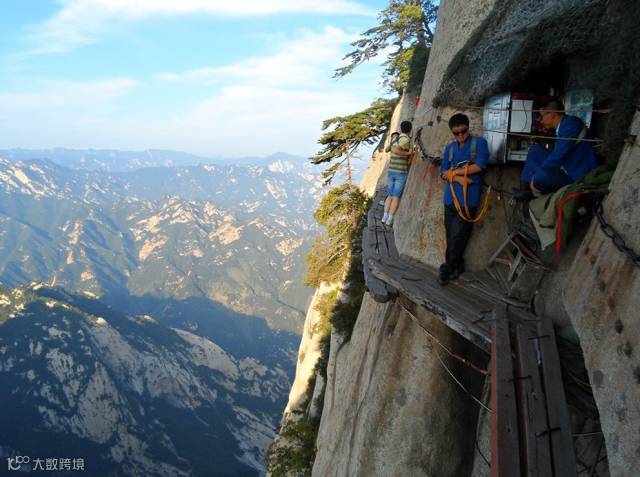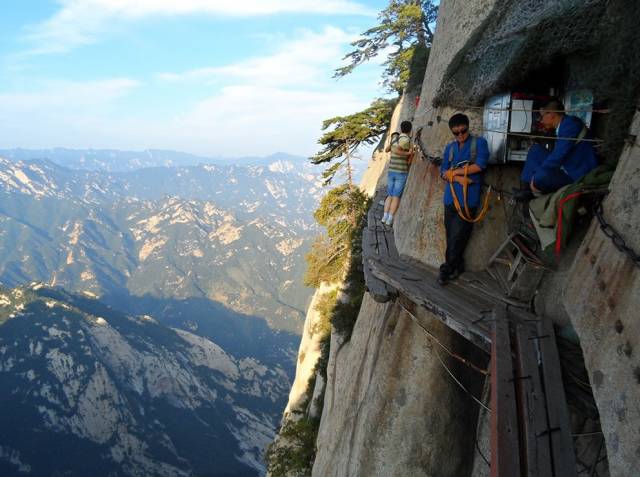 这里是属于勇敢者的地方,在2000多米高的峭壁上沿着筑在壁面的木板前行,一边空悬并无栏杆,一边崖上钉有铁索可供抓手。