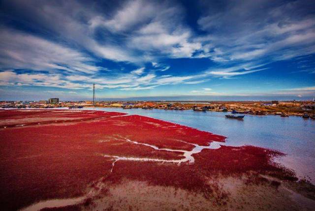 盘锦红海滩像一幅巨大的猩红色地毯铺展在平阔的海滩上,远远望去层层叠叠,漫无尽头,蔚为壮观。