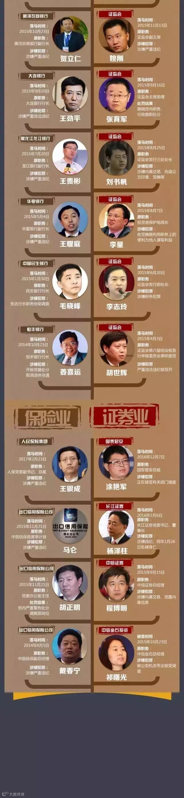 其中,7名中管干部的分布是:3人属保险、2人在证券、2人为银行。而在10名央企和金融单位干部中,2人属保险、3人在证券、5人为银行。省管干部则较为简单,银行14人,投资23人。