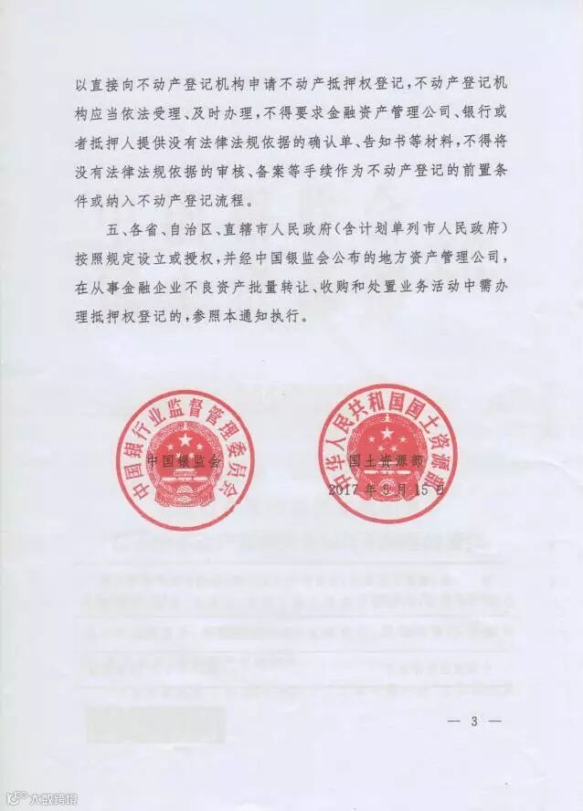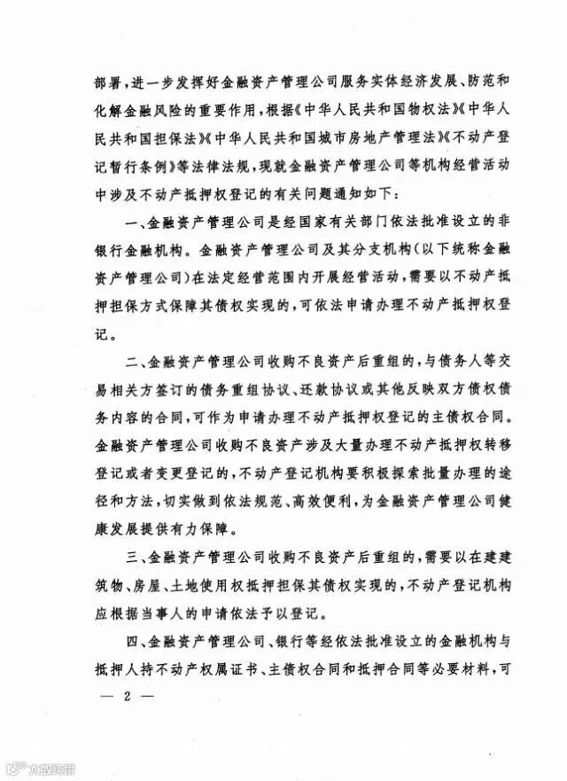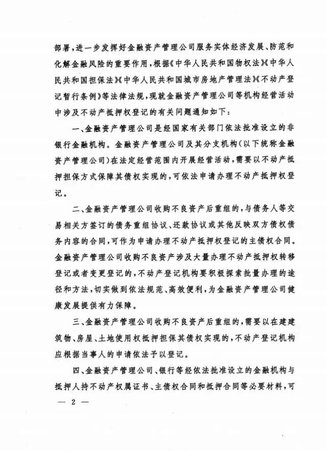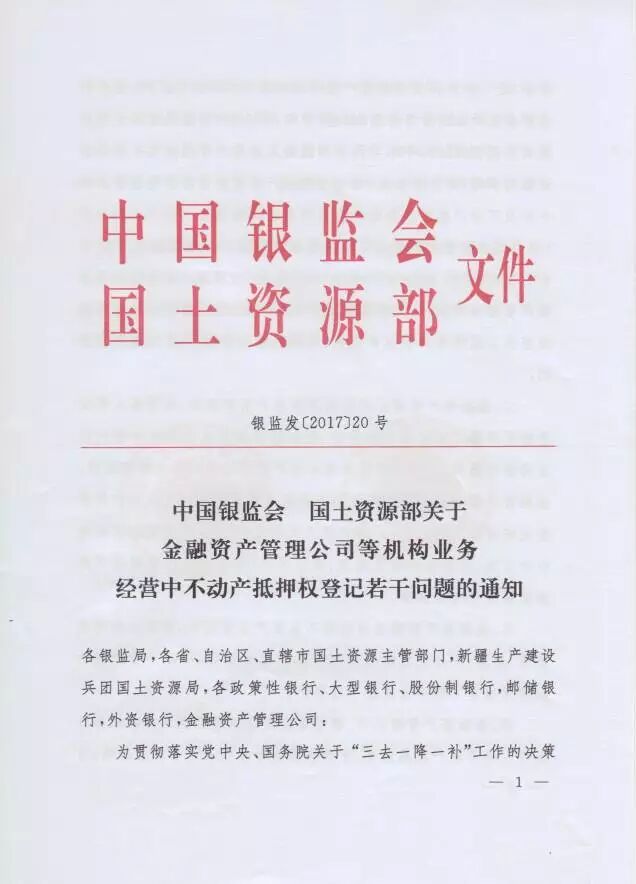 为贯彻落实党中央、国务院关于“三去一降一补”工作的决策部署,进一步发挥好金融资产管理公司服务实体经济发展、防范和化解金融风险的重要作用,银监会与国土资源部联合下发了《中国银监会、国土资源部关于金融资产管理公司等机构业务经营中不动产抵押权登记若干问题的通知》,旨在解决资产管理公司“登记难”、“变更难”等问题,为资产管理公司消解地方不良债务、企业不良资产打开了“绿色通道”。