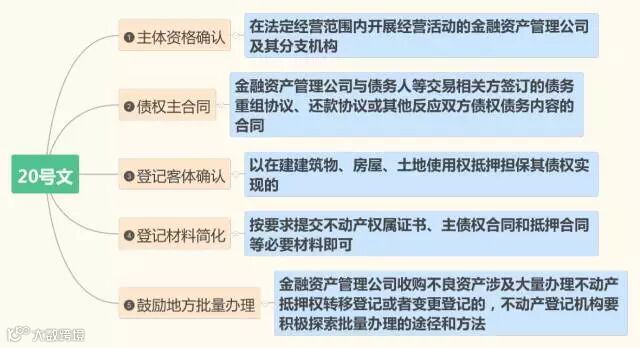 20号文中,强调不动产登记机构要积极探索批量办理的途径和方法,切实做到依法规范、高效便利,为金融资产管理公司健康发展提供有力保障。