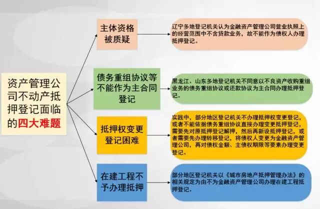 登记机关质疑资产管理公司抵押权登记的主体资格。很多地方地区登记机关以不懂、从没办理过以及资产管理公司不具有贷款资格等为由,拒绝为资管公司及其分支机构办理抵押权登记及相关抵押登记手续。