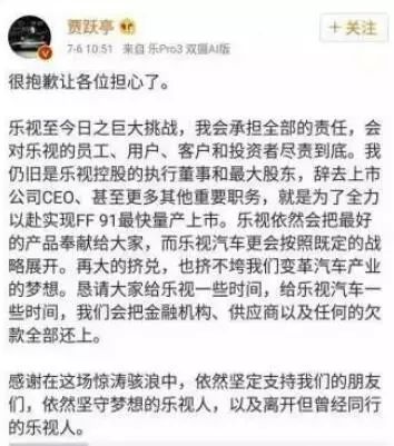 (上午说“尽责到底”,下午辞去一切!请注意:贾是一月前计划悄无声息得先辞乐视控股,一个月后人安全到美国后才公告辞职乐视网!哈哈,孙宏斌估计都懵了!地产干得再牛也想不到互联网水这么深吧!)