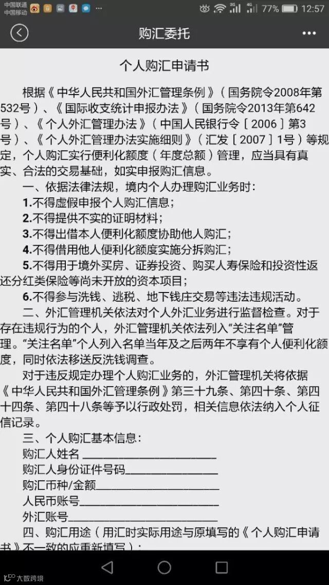2017年伊始,无论是手机网银、网点自助购汇机还是网点柜台购汇时,都需要先填写一份《个人购汇申请书》(下称《申请书》)。