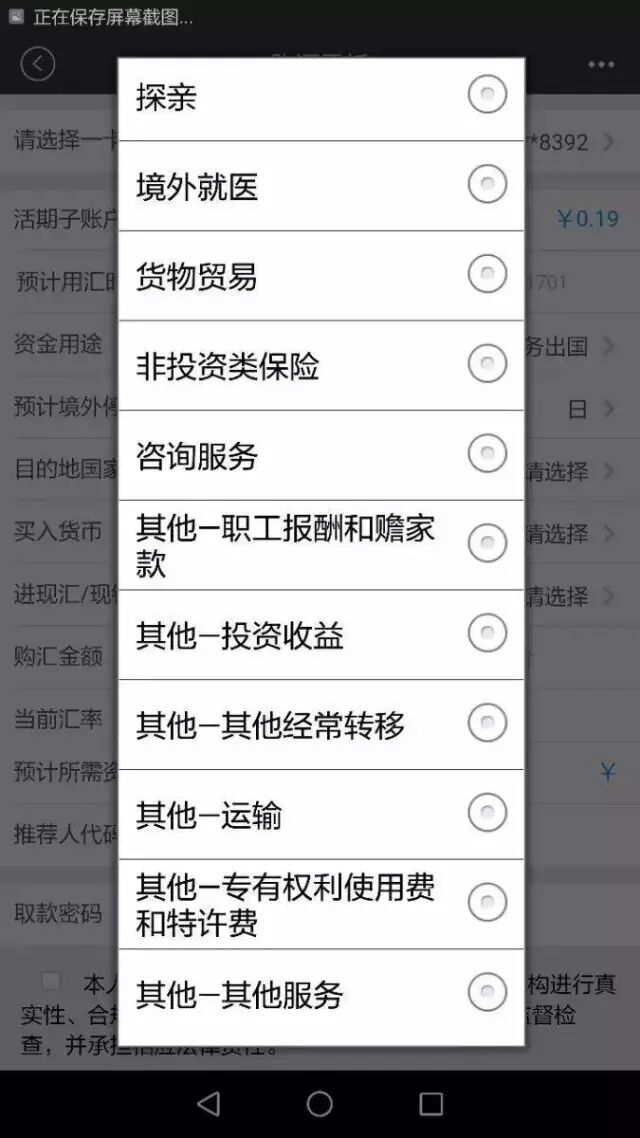 记者某股份制商业银行手机银行上发现,《申请表》虽然9个大项的子项繁多,但实际操作中并不需要对所选取的子项一一填写。系统依然延续了打钩模式。以招商银 行手机银行为例,勾选确认知晓《申请书》后,资金用途只需从14种列出的用途中勾选一项。14种用途分别为除了上述8项《申请书》列出的大项外,还包含了 6个其他项:”其他-职工报仇和赡家款、其他-投资收益、其他-经常转移、其他-运输、其他-转悠权利使用费和特许费、其他-其他服务“。
