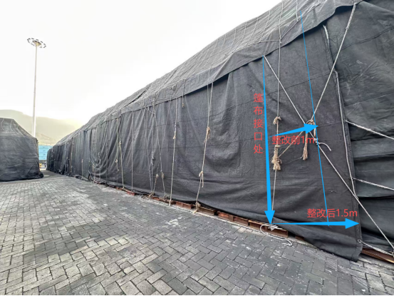 本次整治着重优化安全标准,将篷布交接处搭接长度从1米统一提升至1.5米,要求所有捆绑绳索扣紧压实,大幅增强货垛防雨防风能力,有效降低货物湿损风险。同时,严格规范现场环境,明确垛档内需保持整洁,杜绝绳头、铁丝等杂物,既消除潜在安全隐患,也让场容场貌更规整。针对货垛布局,CFS统一划定堆码基准线,确保定位整齐有序,并将货垛间距严格控制在1-1.2米,既保障消防通道畅通,又提升场地利用率。为让新标准落地见效,CFS建立班组日常检查与管理人员随机抽查相结合的巡查考核机制,发现问题立即整改、严肃追责,杜绝巡检流于形式。