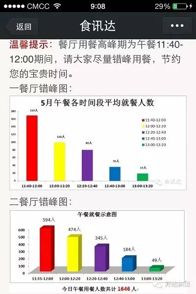 万达食堂的微信公众号,每天9点40左右,就会给员工发送菜单。如果你看到当日菜单不喜欢,可以绕道出去吃,喜欢就看着错峰时间表,挑人少的时候来。