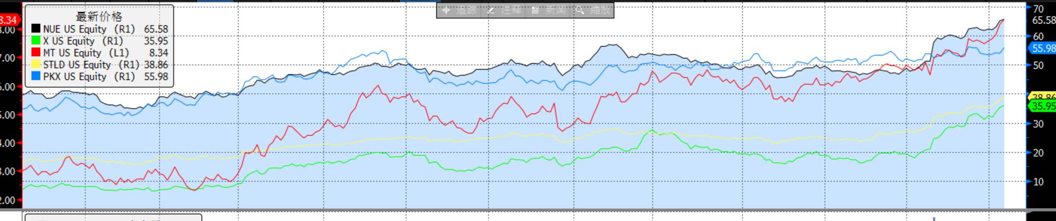 2、今年美国标普500行业分类回报:钢铁63%的回报,仅次于黄金84%。个股看:市值209亿美元的NUE涨幅64%,市值255亿美元的米塔尔涨幅98%,市值62亿美元的美国钢铁X涨幅350%,市值95亿美元的动态钢铁STLD涨幅117%,市值195亿美元的浦项钢铁涨幅最低,为58%。