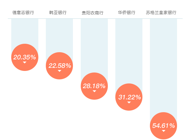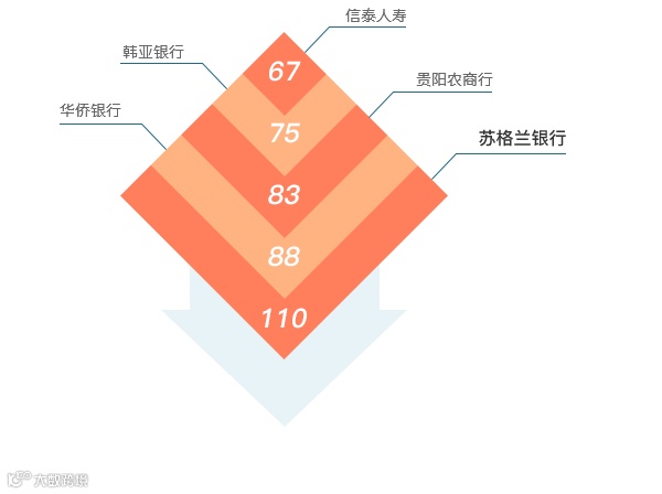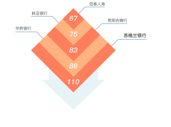 排名下降最多的分别是:苏格兰皇家银行(下降110名)、华侨银行(下降88名)、贵阳农商行(下降83名)、韩亚银行(下降75名)、信泰人寿(下降67名)。