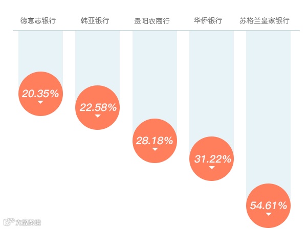 有26家金融机构2015年底总资产同比负增长,缩水最严重的5家均为银行,分别为德意志银行(-20.35%)、韩亚银行(-22.58%)、贵阳农商行(-28.18%)、华侨银行(-31.22%)、苏格兰皇家银行(-54.61%),其中4家为外资行。