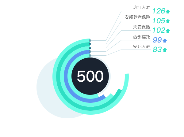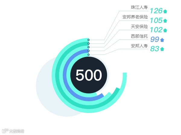 500强榜单中,排名上升最快的分别为:珠江人寿(上升126名)、安邦养老保险(上升105名)、天安保险(上升102名)、西部信托(上升99名)、安邦人寿(上升83名),去年表现耀眼的安邦人寿、珠江人寿和天安财险今年仍增速未减。
