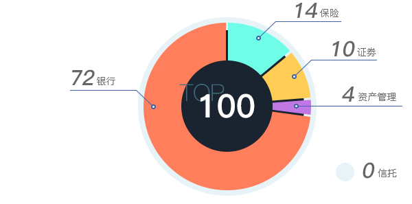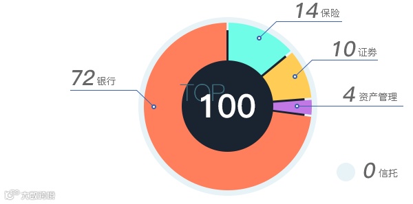 前100名中,银行占据了72个位置,其余为14家保险公司,10家证券公司和4家资产管理公司,前100名中再次无信托公司身影。