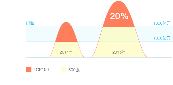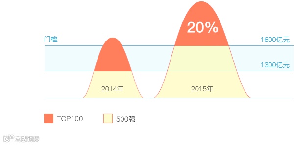 今年的500强TOP 100上榜门槛提升至1600亿,较去年门槛又提高了300亿,也就是说,2015年中国金融500强企业中,有20%的企业资产超过1600亿。