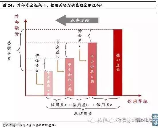 外部资金运用本质仍是核心企业与中小企业的信用差。供应链金融较为保守的模式,即核心企业利用自身信用优势获得外部资金,同时基于自身对中小企业业务往来形成的风控优势,针对中小企业进行资金融通业务。核心企业和中小企业在外部融资能力上的差别是信用的差别,供应链金融存在的基础也即企业之间的信用极差。