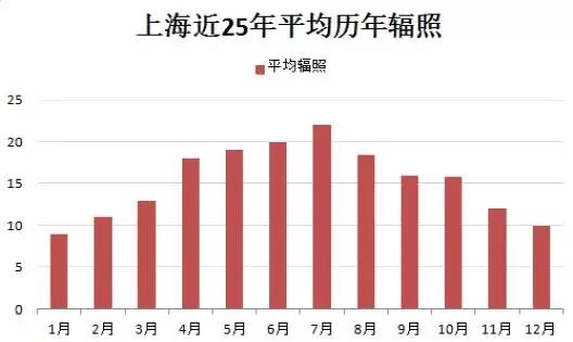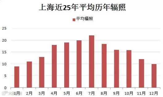 根据上海地区近25年的气象平均数据做一个期望,可以看出每月平均辐照时间。与上表年发电量情况相比,除了2015.11月实际发电量较差以外,其他月均符合设计预期。