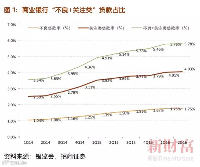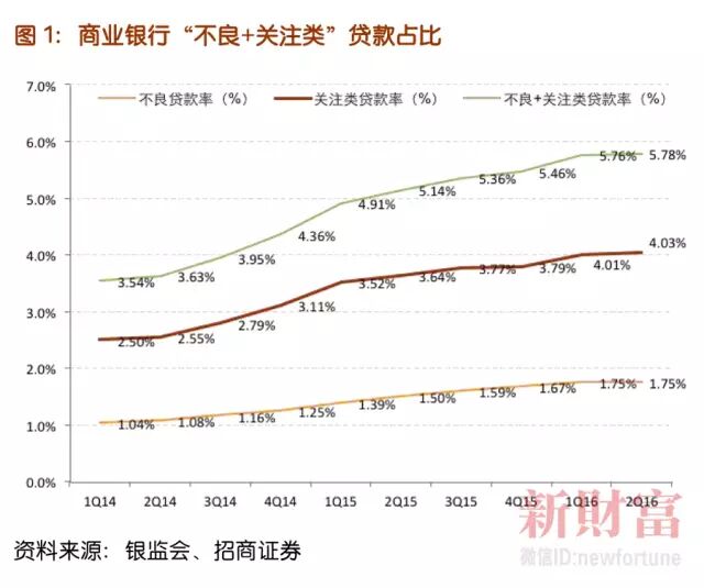 1、按照银监会“商业银行”口径,中国银行业2016年中期不良率分别为1.75%,若将关注类贷款全部纳入不良贷款,中国银行业2016年中期潜在不良率(不良+关注类贷款率)为5.78%。