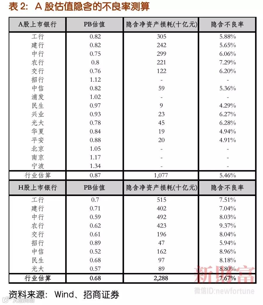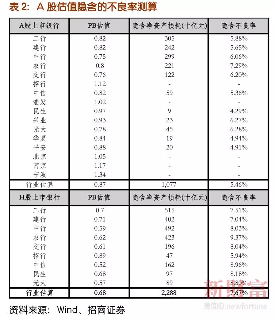 我们可以2016年为基准年份,将当年预期盈利和超额拨备全部用于覆盖坏账,再以估值计算银行净资产的消耗,换算成隐含的不良率(表2)。以A股上市银行为例,按2016年8月31日收盘价计算,A股上市银行平均估值为0.87倍PB。这一估值水平所隐的不良余额为3.6万亿元,具体计算过程如下: