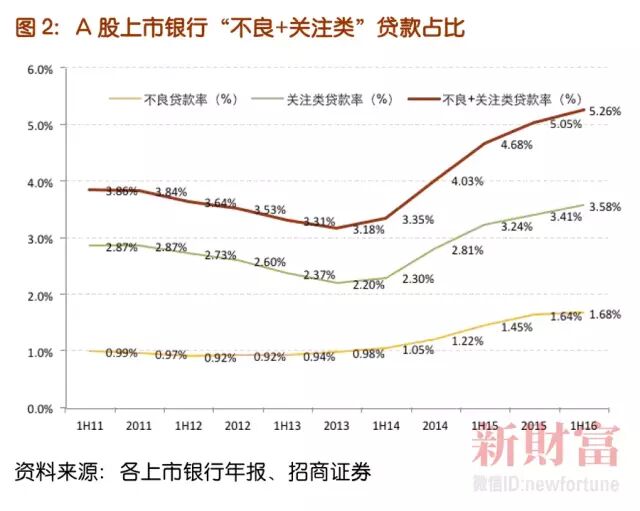 以A股上市银行口径观察,不良贷款的暴露要更早一些。2012年以来贷款资产质量恶化的压力逐步凸显。2015年底上市银行“不良+关注类”贷款余额为3.06万亿元,占比5.05%(其中不良贷款占比1.64%,关注类贷款占比3.41%);2016年上半年末,上市银行“不良+关注类”贷款余额上升至3.42万亿元,占比上升至5.26%(其中不良贷款占比1.68%,关注类贷款占比3.58%),较2015年底上升21bps(图2)。