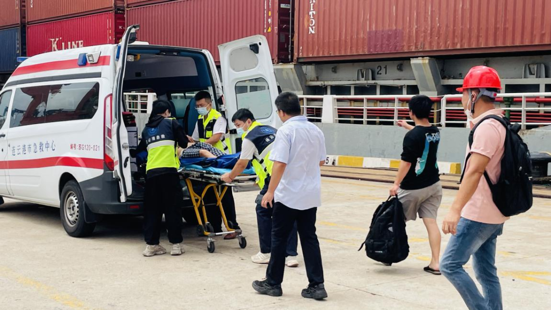 12时10分,救护车在应急车引导下抵达预靠泊位;