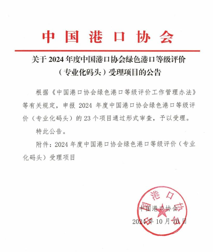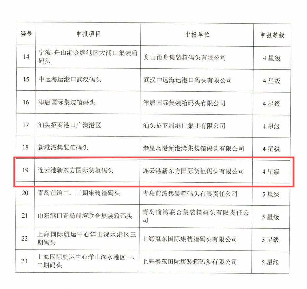 10月10日 ,根据《绿色港口等级评价指南》和《绿色港口(专业化集装箱码头)等级评价指南实施细则》(试行),连云港货柜码头以综合得分94.99分,“行动”单项得分98.28分的成绩满足《绿色港口等级评价指南》的绿色港口4星级评价标准,顺利通过由中国港口协会组织的四星级绿色港口形式审查。