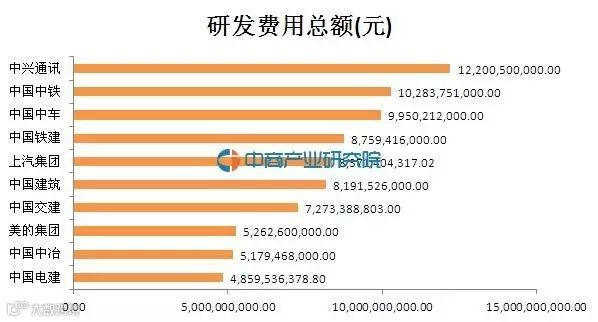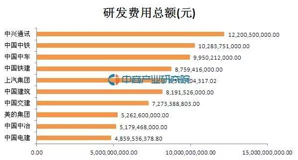 据中商产业研究院统计,2286家上市公司2015年度总计支出研发费用3613.72亿,平均研发费用1.58亿。从研发费用总额来看,同样通信行业的中兴通讯以122.01亿位居第一,中国中铁和中国中车分别以102.84亿和99.5亿分列二三位。