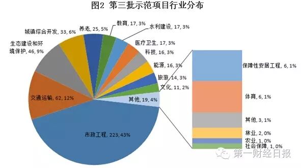 第三批示范项目涉及能源、交通运输、水利建设、生态建设和环境保护、市政工程、城镇综合开发、农业、林业、科技、保障性安居工程、旅游、医疗卫生、养老、教育、文化、体育、社会保障和其他18个一级行业,主要集中在市政工程、交通运输、生态建设和环境保护、城镇综合开发四类行业,这四类项目投资总额占全部项目投资额的87%。其中,交通运输类项目(高速公路、铁路等)总投资规模超过5000亿元,其次为市政工程类项目(市政道路、污水处理项目、垃圾处理等),总投资额超过3000亿元,仅此二者的占比就超过了70%。