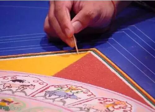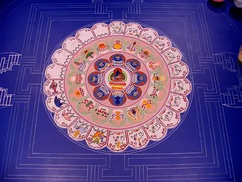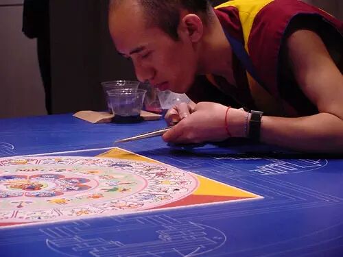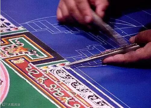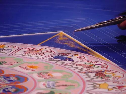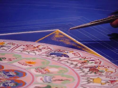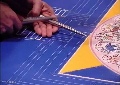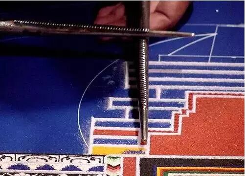 这一绘画工作是先使用画笔拉出框线,然后逐渐把各色矿石粉沙堆积在一起(不用任何粘合剂和湿性液体)而逐渐成为一个佛陀之城,最后完成仪式,来展现佛陀教导的一切都是无常的真理。