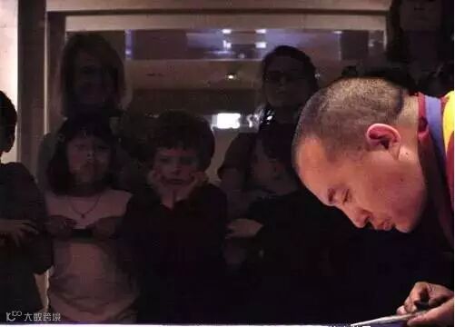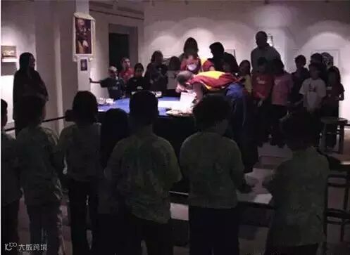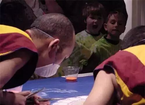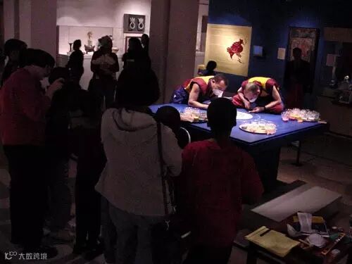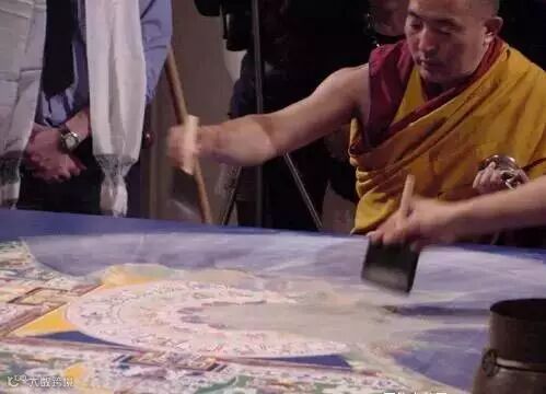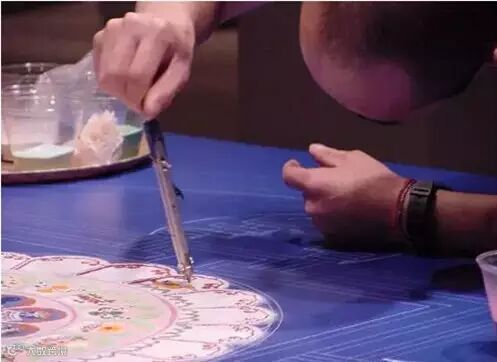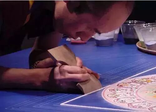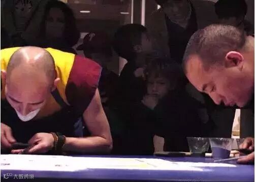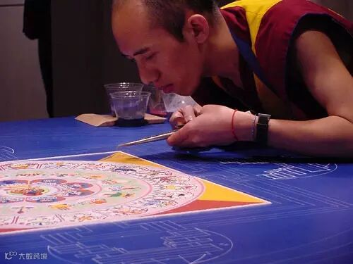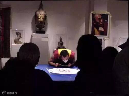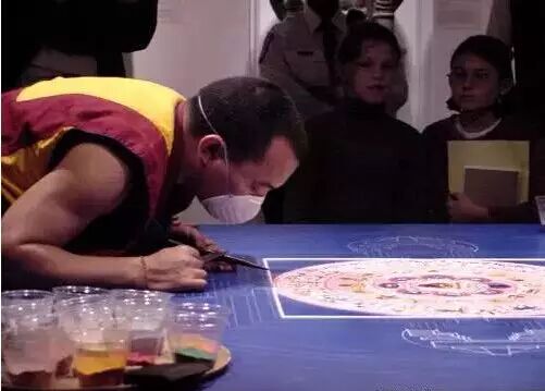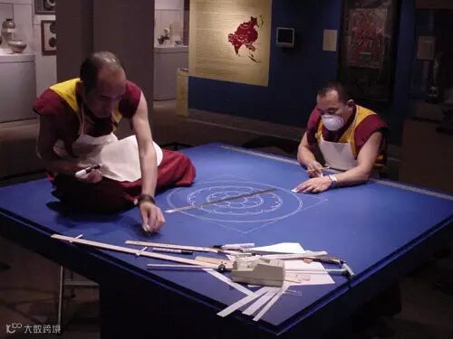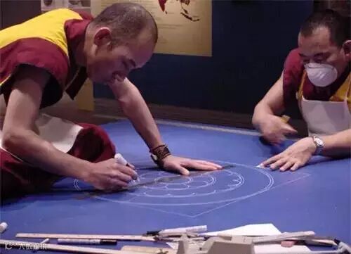 其中一个僧人带着口罩是为了防止呼吸把坛城画布上堆积的矿石粉吹散。