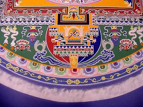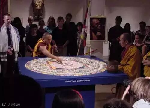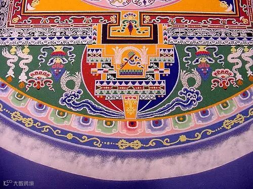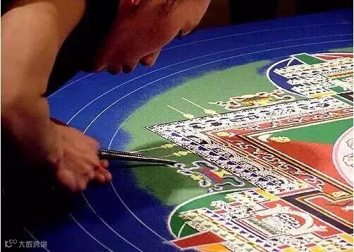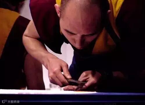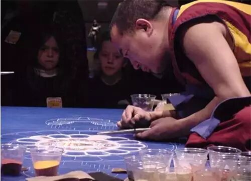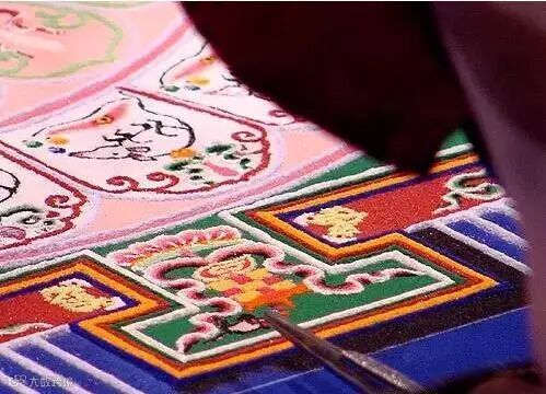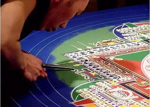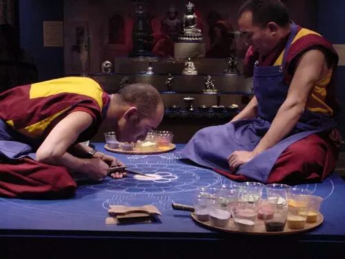 每逢大型法事活动,寺院中的喇嘛们用数百万计的沙粒描绘出奇异的佛国世界,这个过程可能持续数日乃至数月。但是,喇嘛们呕心沥血、极尽辛苦之能事创作出的美丽立体画卷,并没有用来向世人炫耀它的华美。用沙子描绘的世界,会被毫不犹豫地扫掉,在顷刻间化为乌 有...细沙将被装入瓶中,倾倒入河流中。
