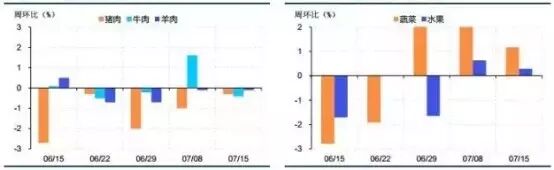 上周农产品价格总体小幅上涨,其中猪肉价格环比继续下跌,蔬菜价格止跌反弹。上周五,农产品批发价格总指数收于199.30,环比上涨0.02%;菜篮子产品批发价格指数收于199.99,环比上涨0.01%。从细项数据看,猪肉价格环比下跌0.30%;牛肉下跌0.41%;羊肉下跌0.11%(图表3)。上周蔬菜价格环比上涨1.17%,水果价格上涨0.29%(图表4)。上周农业部公布的存栏量数据显示,6月能繁母猪存栏3760万头,环比持平;生猪存栏3.76亿头,环比增加0.7%。在3月止跌后,市场一度预期能繁母猪存栏将进入恢复期,但从实际情况来看,存栏仍在底位徘徊,大规模补栏并没有出现,猪周期或将延后。
