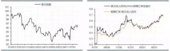图表7 上周美元指数小幅上涨 图表8 在岸和离岸人民币跌势暂缓