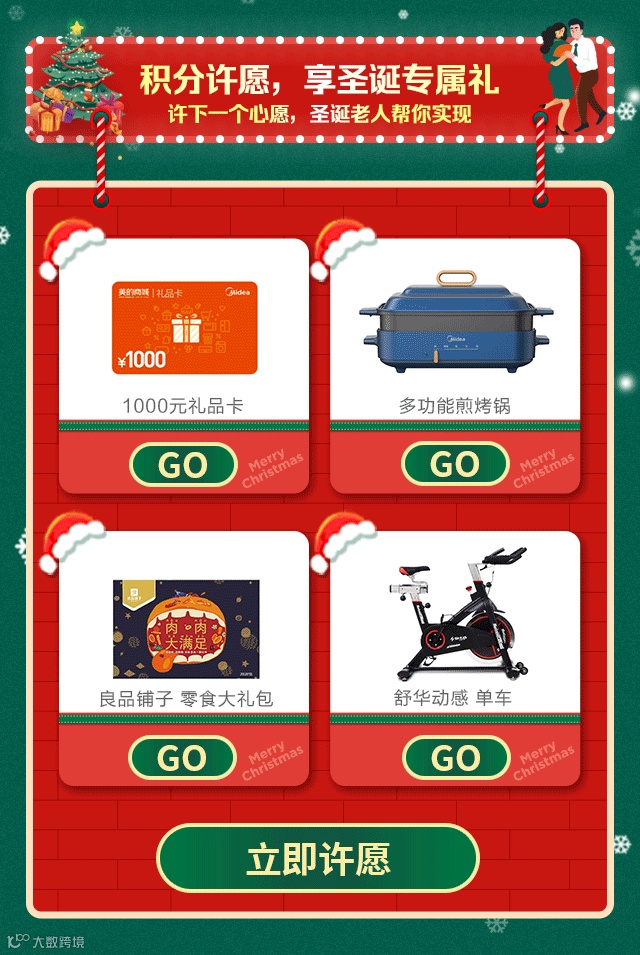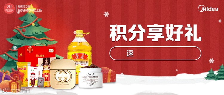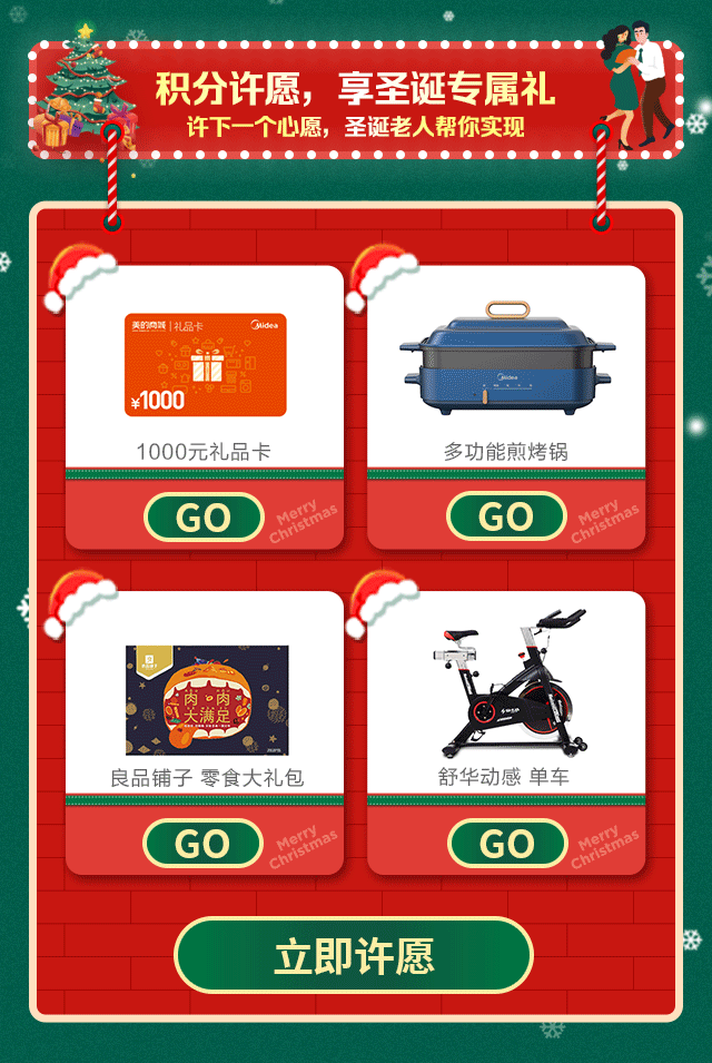 今年圣诞节的许愿池依旧有着满满的魔力哦,快来许下你的礼物愿望吧!用户投入美的积分许愿,集齐愿望后25日、28日两次开奖。