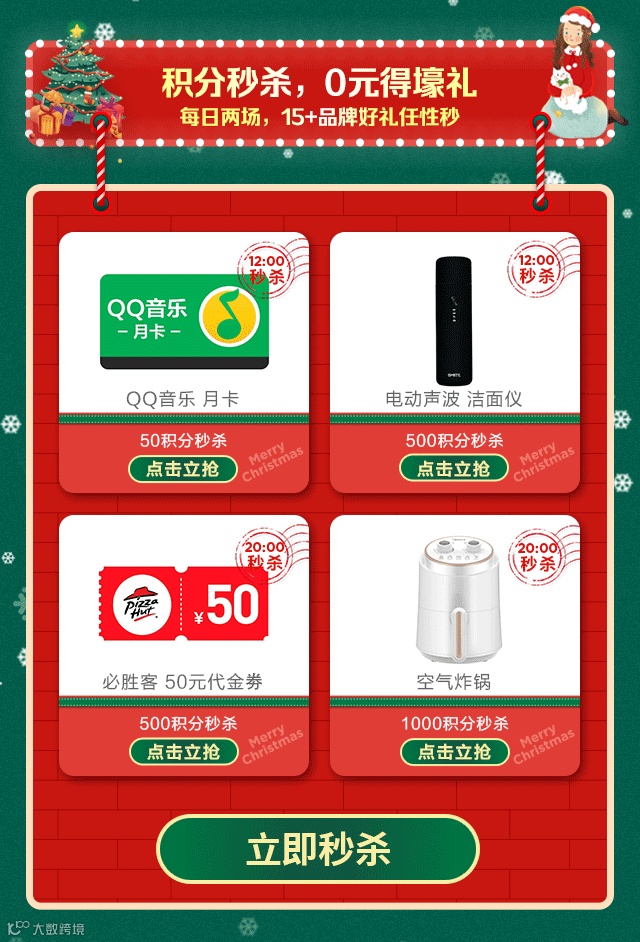截止到12月31日,每天12点、20点准时积分秒杀~