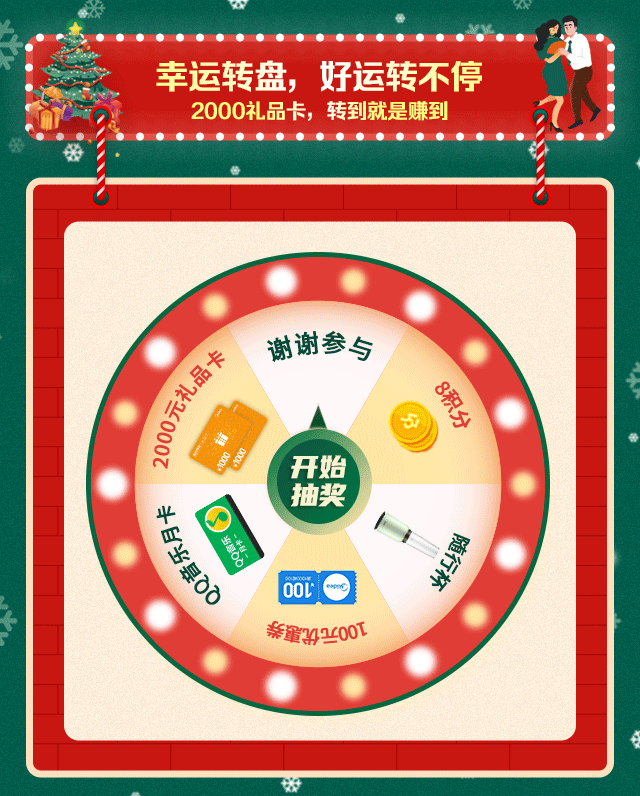圣诞style的大转盘里,已经安排上满满当当的礼物啦:2000元礼品卡、QQ音乐月卡、随行杯......