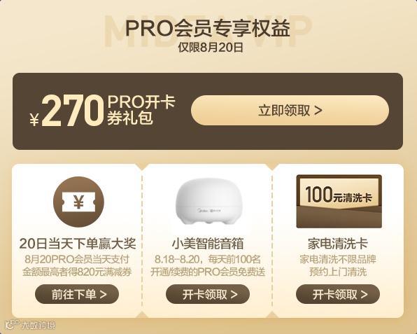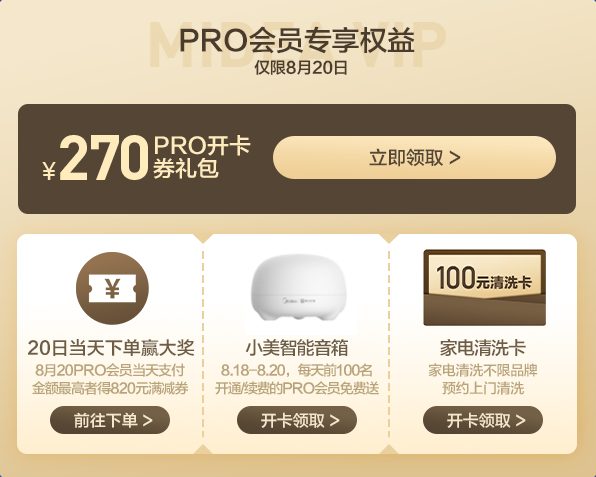8月18-20日,PRO会员享520元真挚礼包;前100名开通/续费PRO即可获得:270元家电开卡礼包/赠送100元家电清洗卡/赠送149小美智能音箱一台。数量有限,还不快来!
