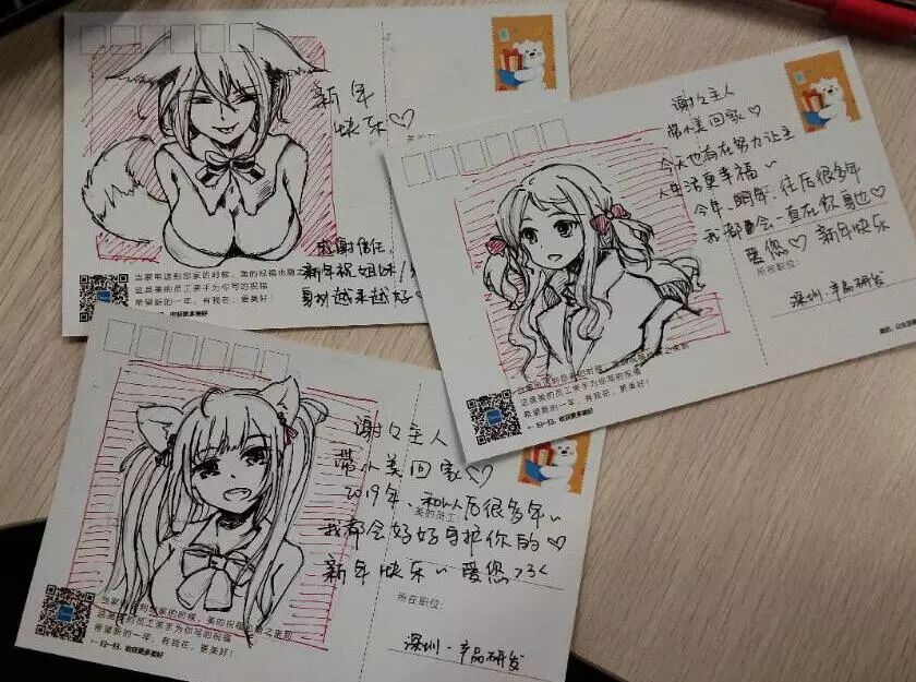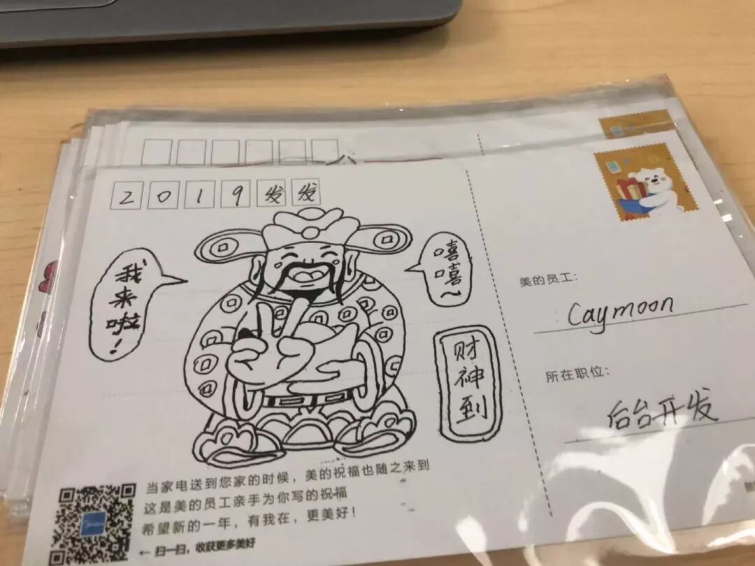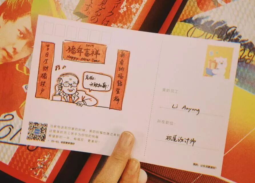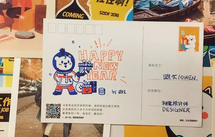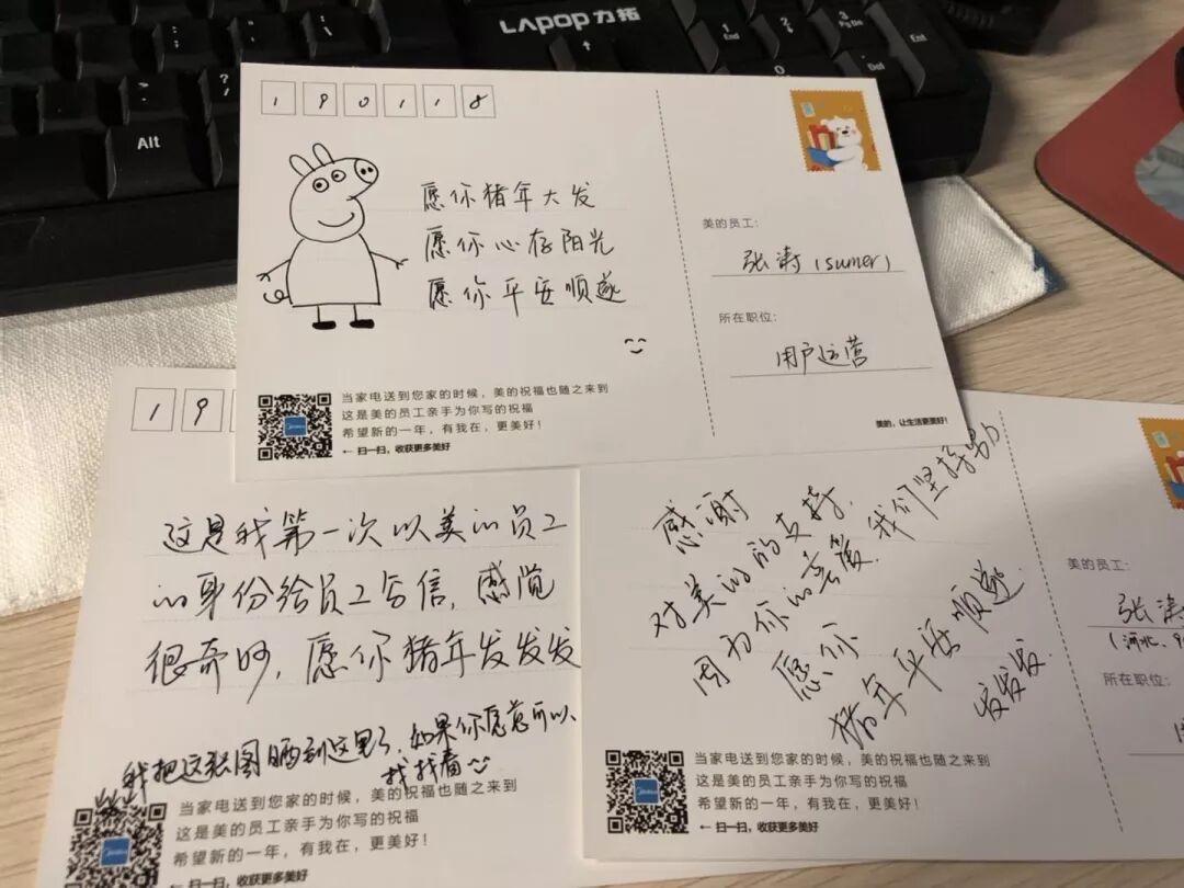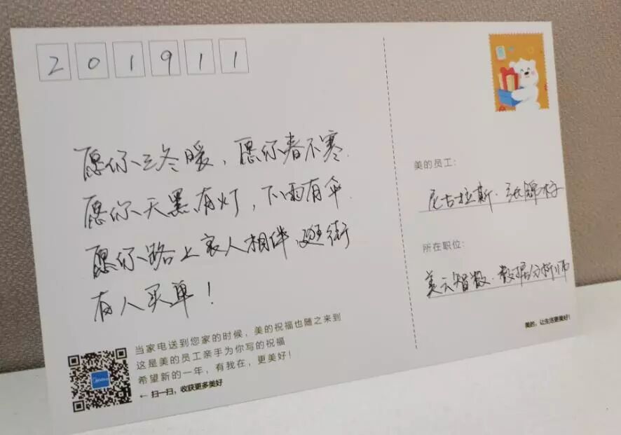年前,我们准备了明信片,交给美的员工,他们亲手写下对用户的新春祝福,可能有简笔画、精美的手绘、诗词歌赋、八国语言、土味祝福……