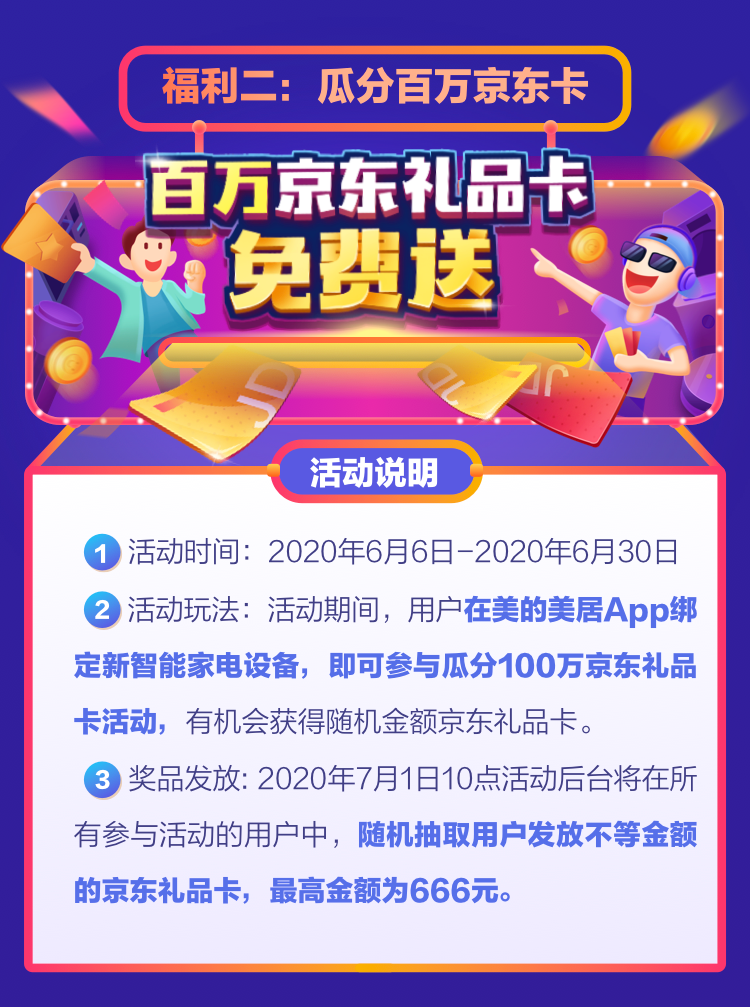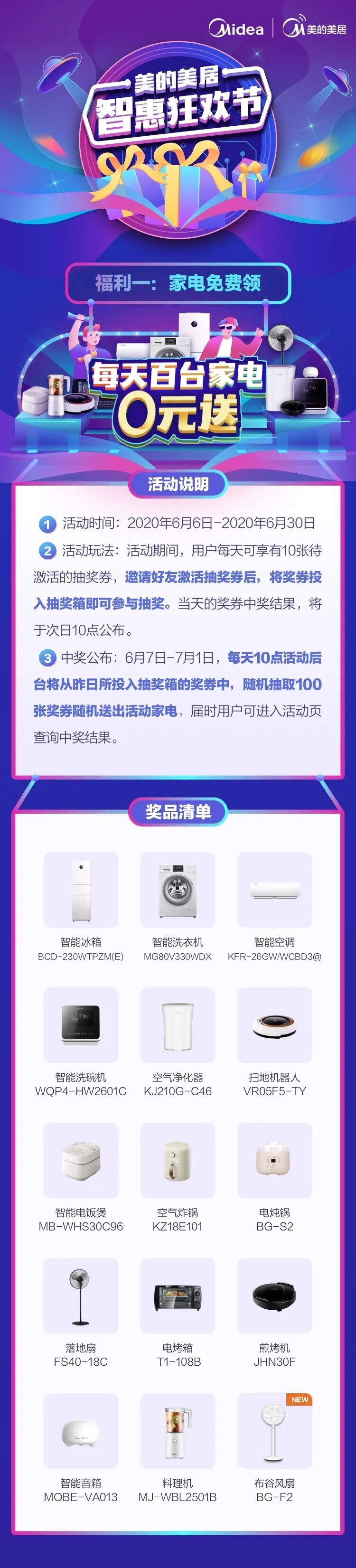 2、6月7日-7月1日,每天10点后台将从昨日投入抽奖箱的奖券中,随机抽取100张奖券随机送出活动家电。