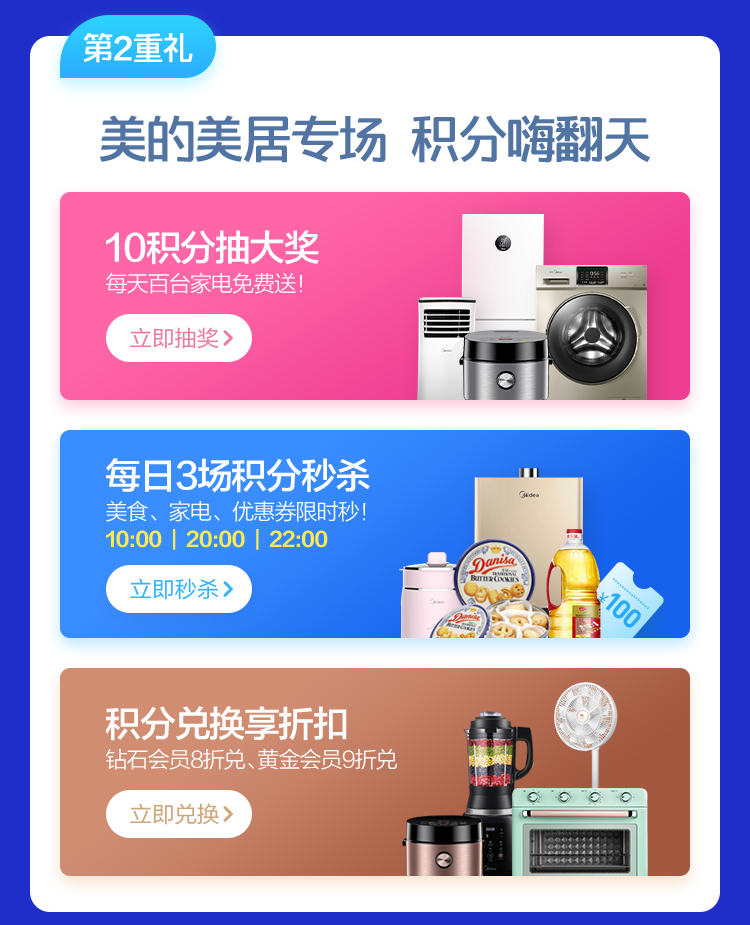 抽不中没关系,美的美居APP每天3场专属积分秒杀-10点/20点/22点!300积分秒杀烤箱、100积分秒杀电饭煲,还有风扇、扫地机器人、洗碗机等家电每天任性秒!