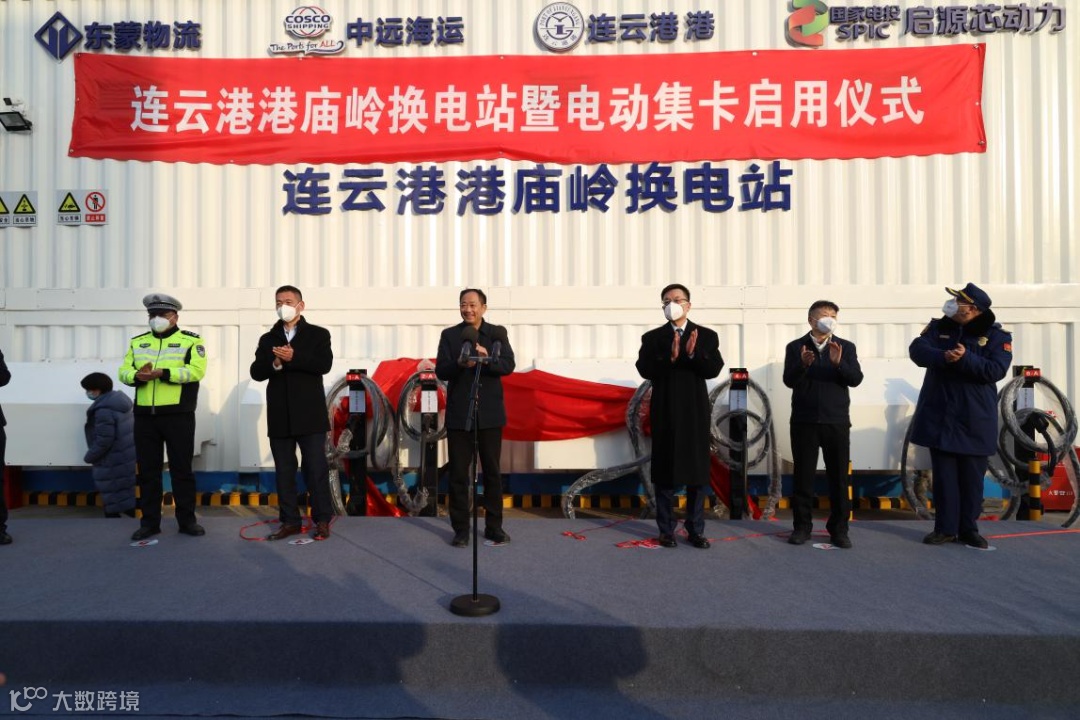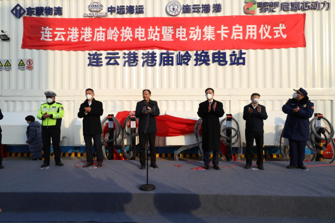 仪式现场,中远海运港口有限公司总经理助理陈栋,连云港港口控股集团有限公司副总裁孙中华,上海瑞泽实业集团有限公司党委副书记、副总裁郭伟,国家电投集团江苏电力有限公司党委委员、总会计师王三度等领导为连云港港庙岭换电站暨电动集卡启用揭牌。