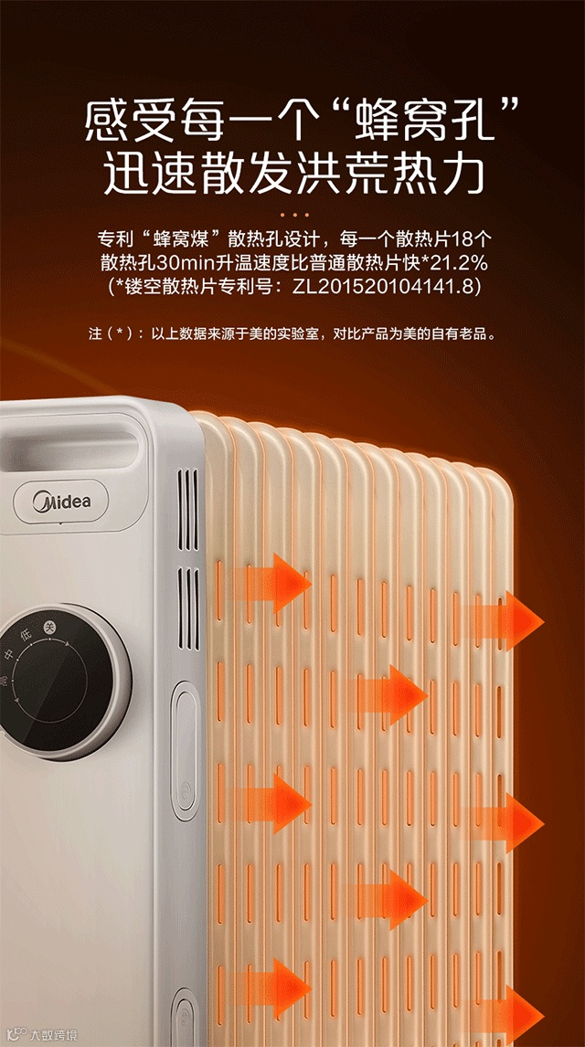 专利的“蜂窝煤”散热孔设计,每一个散热片18个散热孔,30分钟升温,速度比普通取暖器散热片快21.2%。多维速热管,制暖更迅速。