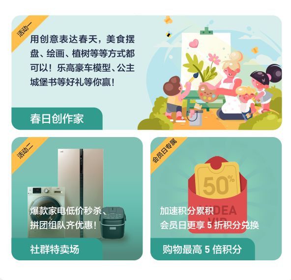 除了参加活动以外,门店在3月20日更有爆款家电低价秒杀、拼团组队齐享优惠、5折积分兑换等活动,当天购物最高享受5倍积分,加速积分累积,升级会员等级,开启更多等级权限。